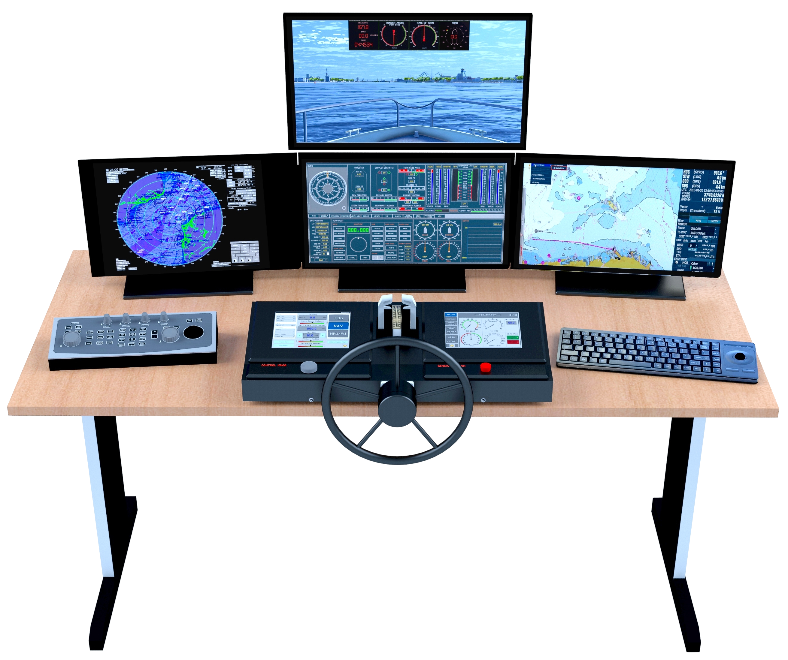 STSTC Desktop Navigation simulator is flexible training solution adaptable for various training environment. NTS-Pro 6100 Desktop simulator provides same functionality as our full scale training systems. The student workstation can be configured for number of different combination between main modules of ARPA/ECDIS/CONNING/VISUALS. STSTC unique design tabletop Steering console equipped with hardware controls dramatically increase reality of the simulation. Tabletop replica of ARPA/Radar keyboard and VHF handset are compliment to this cost-effective training solution. Operation is done through touch screens and hardware controls or mouse/computer keyboard. The simulator can be used as Stand-alone of Networked solution.